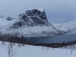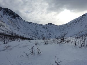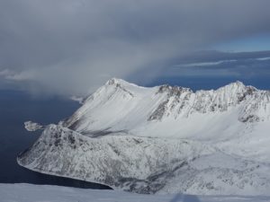 Cette course classique nous fait découvrir le parc national de Ånderdalen. Nous remontons la combe évidente menant au sommet par des pentes débonnaires. Nous sommes de nouveau seuls comme la plupart du temps lors de ce séjour. Au sommet nous voyons le mauvais temps arriver à grand pas. Nous sommes maintenant un peu plus familier avec les rideaux de neige lointains qui s’engouffrent dans les fjords pour se bloquer contre les massifs de l’île.