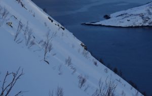 Mais comme une journée n’est jamais véritablement terminée avec ce groupe, Julien propose d’aller enchaîner avec le Latræva couloir au bout du Steinfjord que nous avions repéré les jours précédents. Il est 16h30, nous allons au pied et constatons qu’une couche de grins ronds instable se trouve 10 à 15 cm sous la dernière chute. Nous sommes fatigués, nous ne voulons pas prendre de risque, nous faisons demi tour. Dommage le couloir avait l’air incroyable. C’est la montagne et il faut savoir prendre certaines décisions.