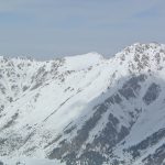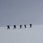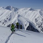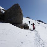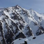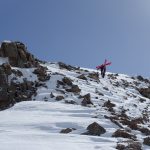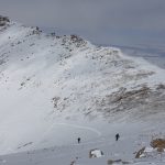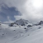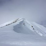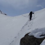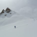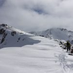 Nous retournons dans la combe du col sans fin, Yvan se réjouit de retrouver ce fameux col mais la fine couche de neige fraîche de la veille facilitera grandement cette deuxième ascension. Cette fois-ci nous irons chercher un sommet en main droite par rapport au col que nous regardons et finissons l’ascension en longeant les immenses corniches sommitales qui dominent le versant nord opposé. Le ciel se bouche à notre arrivée au sommet et nos rêves de descente sous le un soleil radieux s’envolent subitement… mais notre patience au sommet paye après quelques minutes et un ciel qui se déchire complètement. Il est temps pour nous de partir en direction de notre couloir.