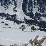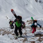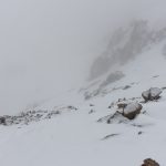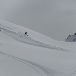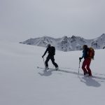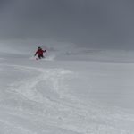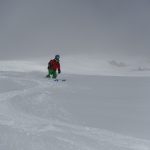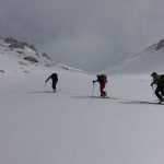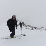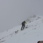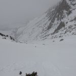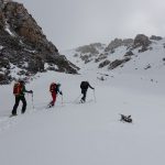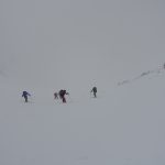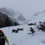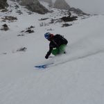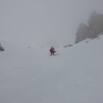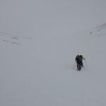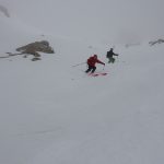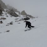 En ce deuxième jour, nous partons dans une combe au sud, mais le temps tourne vite et une fine neige nous accompagne toute la matinée. Nous remontons une combe qui n’en finit plus, le col est en vue depuis le bas mais nous avons l’impression qu’il recule à longueur que nous avançons… Une fois arrivé sous ce fameux col, nous tirons main gauche pour aller trouver l’entrée d’un couloir. Les tours de granite qui le jonchent nous donnent des repères visuels dans ce jour blanc. La fine pellicule de neige fraîche repose sur un manteau dur, l’accroche est parfaite pour cette descente de 800m à près de 35°.
