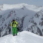 Retour dans les versants nord pour ce quatrième jour. Nous reprenons la même combe qu’au premier jour mais basculons au col dans une nouvelle vallée. Xavier est à la trace dans cette neige toujours profonde et très froide. Nous décidons de nous rendre au sommet d’un mont se trouvant au milieu de ce vallon. Nous terminerons l’ascension par quelques pas dans le cailloux et nous pouvons profiter encore une fois du paysage à 360° au sommet.