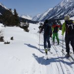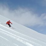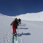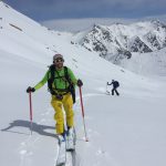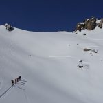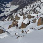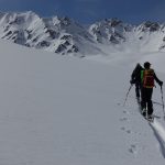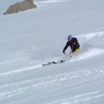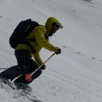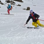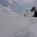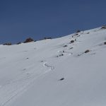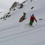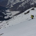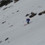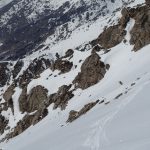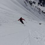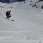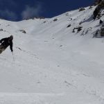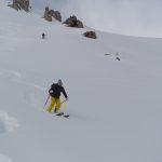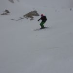 Le cheminement est subtil est nécessita pas mal d’observations de la part de Xavier pour trouver l’entrée du couloir. Nous débutons notre descente dans une combe Sud est ou la neige poudreuse a su rester très froide à cette altitude. Au bas de cette belle pente, nous tirons rive droite pour trouver l’entrée du couloir de 800m de long. L’entrée est à 40°, la ligne de pente est directe conservant une pente régulière sur les deux tiers de la descente. Nous descendons dans les pentes les plus au sud pour y trouver une neige parfaitement transformée bien portante, cette dernière descente est un vrai régal sous nos spatules…