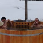 Le camp dispose également d’une tente sauna (oui, une tente russe permettant d’avoir un sauna à l’intérieur) dans laquelle nous pouvons faire un brin de toilette. L’autre « plus » du camp est le bain nordique qui nous offre d’excellents moments de détente en fin de journée. Nous n’avons jamais eu froid malgré les -25° des nuits, le vent ou la neige. Slava est constamment là pour nous demander s’il faut rajouter un peu de bois dans le fourneau, s’il nous manque quelque chose; un sens du service incroyable et une gentillesse touchante de ce personnage que nous ne serons pas près d’oublier… Les repas sont tous excellents et vous aurez compris que le logement en yourte présente quelques avantages…
