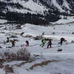 La nuit a été froide par un grand ciel clair, -25° affiché au thermomètre et la fin de nuit dans la yourte fut fraîche et le bonnet nécessaire pour certains en plus du bon gros duvet ! Xavier décide de nous emmener aujourd’hui vers une immense pente de 1200 mètres en forme de triangle, toujours en versant sud. Ce beau panneau régulier nous aura entraîné aux conversions pendant plus de 3 heures d’ascension pour atteindre les presque 3800m d’altitude en son sommet.