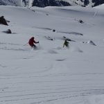 Nous retrouvons cette neige poudreuse si particulière lors de la descente, quelques passages se sont légèrement transformés avec un peu de neige cartonnée mais cela reste globalement très très bon de haut en bas.