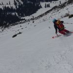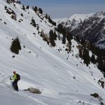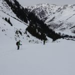 Le temps de poser nos sacs dans une des yourtes, de saluer Iulia la cuisinière et Slava l’homme à tout faire du camp, il ne reste plus qu’à refaire nos sacs à dos avec tout le matériel nécessaire et de coller nos peaux pour la première fois. Nous nous dirigeons dans une combe en versant nord pour rejoindre un col à 3300m d’altitude. Rapidement nous nous rendons compte de la spécificité de la neige kirghize, une neige extrêmement froide et sèche dont la densité est relativement faible et la constitution est principalement faite de gobelets et de grains à faces planes sur parfois un mètre d’épaisseur, le doute est donc souvent présent.