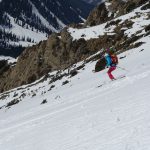 Une fois le coup d’œil du sommet passé, nous entamons la descente dans une première pente nord-ouest dans une neige poudreuse que seul le Kirghizistan peut offrir. Puis après un passage à un col, nous rebasculons dans la grande pente sud du matin pour enchaîner nos virages dans les 10 centimètres de neige tombé la veille. Un régal !