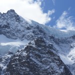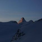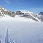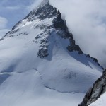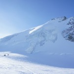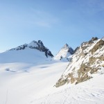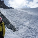 Le lendemain matin et après la redescente matinale par les longues et abruptes échelles du refuge, nous nous sommes dirigés en direction de Tête Blanche par le long et très paisible glacier du Mont Miné. Le Cervin, la Dent Blanche et la Dent d’Hérens étaient tous proches de nous sous un grand soleil et une fraîcheur matinale agréable.
