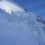 Ensuite, nous sommes descendus en direction du col Sud des Dents de Bertol et avons skié aux bonnes heures sur le versant ouest en restant à droite de la très impressionnante barre de sérac, dans une pente soutenue en neige dure et froide.