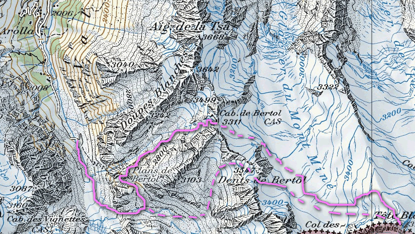 | 1724m | Massif : Valais Secteur : Valais W – Alpes Pennines W Description 2ème jour Descente Du col S des dents de Bertol, plonger versant Ouest en restant assez proche des falaises à droite (en descendant). Le haut de la descente surplombe une grosse barre de séracs que l’on passe par la droite le long des falaises (35/40° sur 200m). Une fois la barre de séracs passée, descendre les vallons Ouest/Sud-Ouest jusqu’au Haut Glacier d’Arolla. Descendre ensuite le bas du glacier puis rejoindre Arolla par l’itinéraire de montée Accès |
