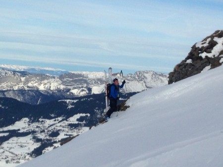 Suivre le sentier qui longe le torrent jusqu’au petit chalet adossé à un superbe sapin (le vargne à Reydet). Continuer sur le chemin qui part à gauche du chalet (E) pour arriver vers un panneau indiquant « La Mandallaz ». Se méfier des avalanches dans la traversée sous le Freu. Rejoindre le chalet de l’Aup du Fier d’en bas (1670m), puis celui d’en haut au SE (1750m). Après avoir franchi le petit torrent, remonter la croupe qui donne accès à un faux plat. Quitter l’itinéraire du col de la Rouelle pour remonter à gauche l’épaule qui conduit à la combe issue du col (2060m environ) situé entre Rouelle et Tête de l’Aulp. Du petit torrent, on peut aussi accéder directement au col en remontant l’intégralité de cette combe. Du col au sommet par l’arête en se méfiant des corniches et, le plus souvent, en déchaussant sur 10m pour franchir un petit ressaut Descente Droit dans la pente SW, 40° au plus raide sur 150m environ, peu exposé, avec la possibilité de skier des pentes moins raides en rive droite. Rejoindre l’itinéraire de montée dans la combe. Il est bien sur possible de descendre par l’arête (AD-), ou seulement depuis le col (PD). |