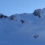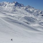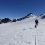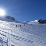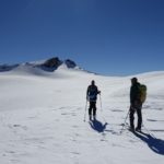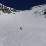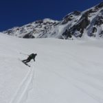 Nous décidons d’aller faire le sommet majeur ou la classique du coin du côté de la Tête du Ruitor et de ces 3486m d’altitude. La montée n’est pas des plus courtes, mais le vallon du Grand est très joli notamment lorsque l’on approche du glacier et que l’on prend pied dessus. Ensuite lorsque le col des Vedettes est atteint, c’est un peu long pour rejoindre le sommet tout au fond de ce grand plateau glacière mais le paysage est splendide et la vue à 360° est époustouflante depuis le sommet. Nous sommes redescendus par le col de l’Invernet qui offre un ski un peu plus festif avec un pente sommitale qui penche un peu sur 150m. Nous avons visé l’horaire idéal pour nous plonger dans la grande combe de l’Invernet qui était en moquette parfaite jusqu’au refuge, du très bon ski de printemps. |