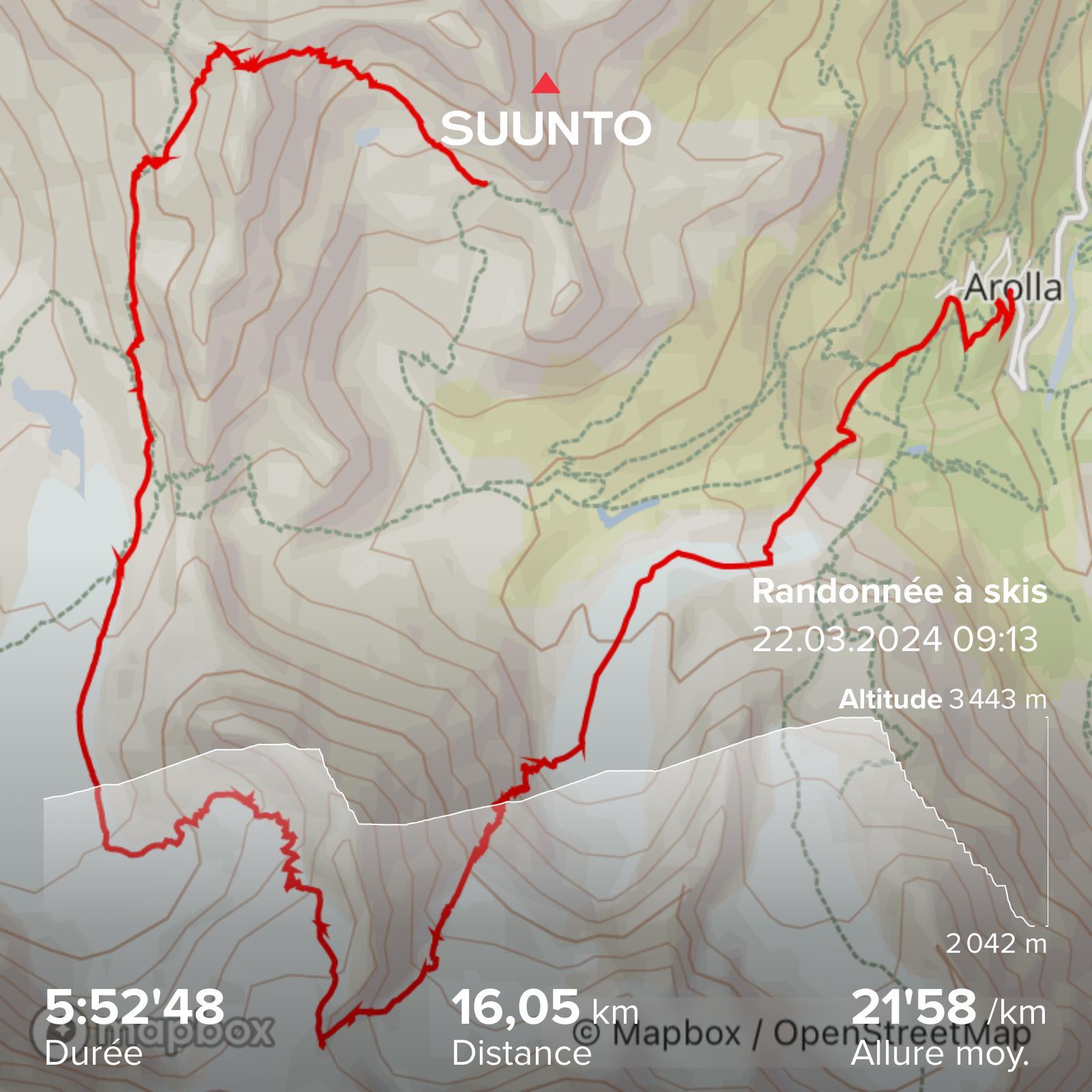 Depuis la station d’Arolla, prendre le téléski de Fontanesse 1 et 2. Coller les peaux au sommet pour prendre la direction de la Cassorte. Franchir le col puis descendre les pentes E en direction du bas du pas de chèvre en passant sous le col de Riedmatten. Repeauter sur le glacier de Cheillon et suivre la voie normale du Pigne par le glacier de Tsenâ Réfien. Glisser jusqu’au pied du mur de la serpentine pour basculer sur le glacier de Tsijiore Nouve, depuis le col du même nom. Skier rive gauche sur ce glacier tourmenté. Prendre les rampes raides main gauche pour sortir sur la moraine et retrouver le bas des pistes d’Arolla. |
