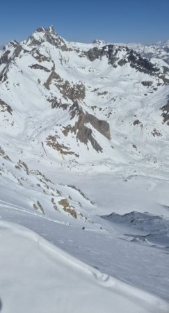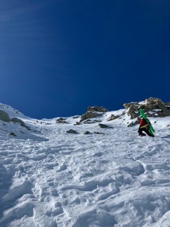 Alors aujourd’hui fut la bonne journée. Neige superbe, froide, poudreuse sur tout le haut et un peu plus tassée en bas. Nous avons tracé en crampons depuis le tiers inférieur.