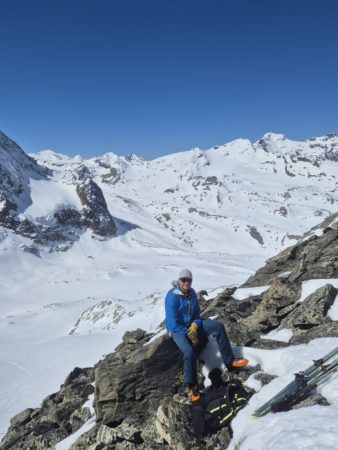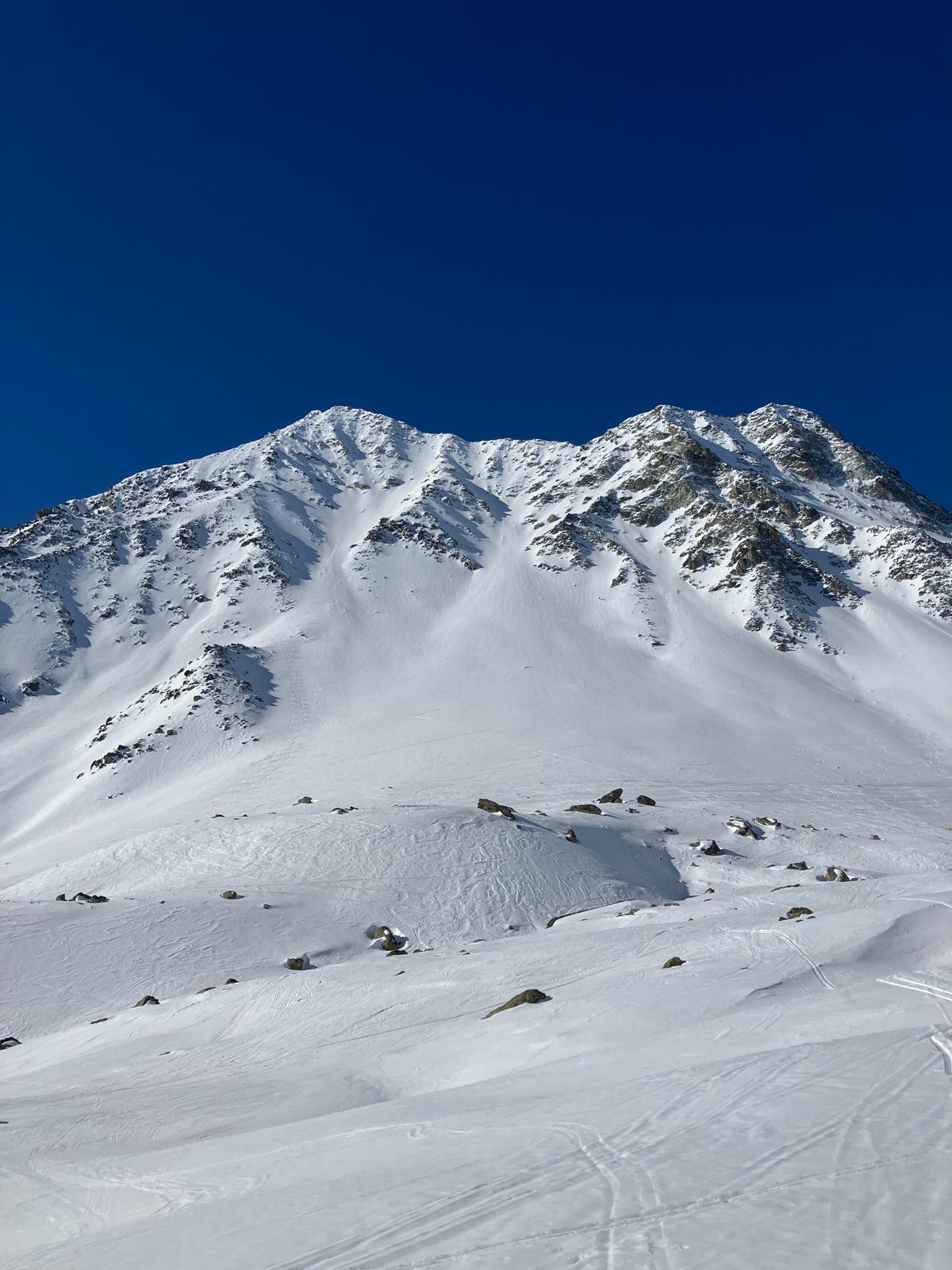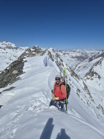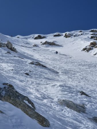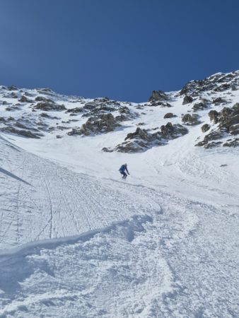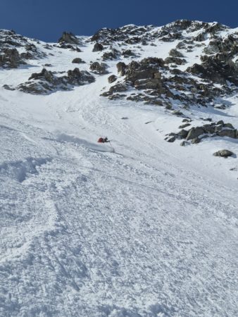 Descente magnifique, raide sur les 50 premiers mètres avec un bon gros 45°, puis ensuite cela déroule. Pas mal de requins présents cette année, les couloirs ne sont pas chargées comme ils peuvent parfois l’être. Magnifique journée encore dans le val d’Arolla.